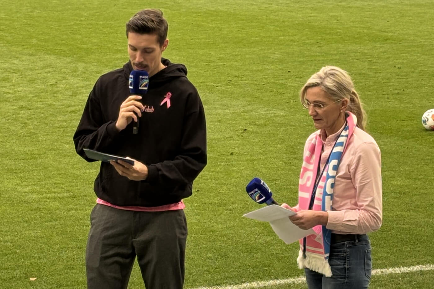 Brustkrebs ist die häufigste Tumor-Erkrankung bei Frauen. 70.000 bis 75.000 Frauen erkranken jährlich neu daran. Fußball-Bundesligist TSG Hoffenheim macht gemeinsam mit dem Brustzentrum der GRN-Klinik Sinsheim auf die Erkrankung und deren Vorsorge-Möglichkeiten aufmerksam, Patientinnen und Mitarbeitende des Brustzentrums liefen im Heimspiel der TSG Hoffenheim gegen den 1. FC Heidenheim gemeinsam mit den Spielern ins Stadion ein. In der Halbzeit-Pause sprach Nadine Michel, Chefärztin der Gynäkologie und Geburtshilfe der GRN-Klinik Sinsheim, mit Stadion-Sprecher Nils Hachmann am Spielfeld-Rand über das Thema. Das Interview wurde live über die Stadion-Leinwand übertragen.