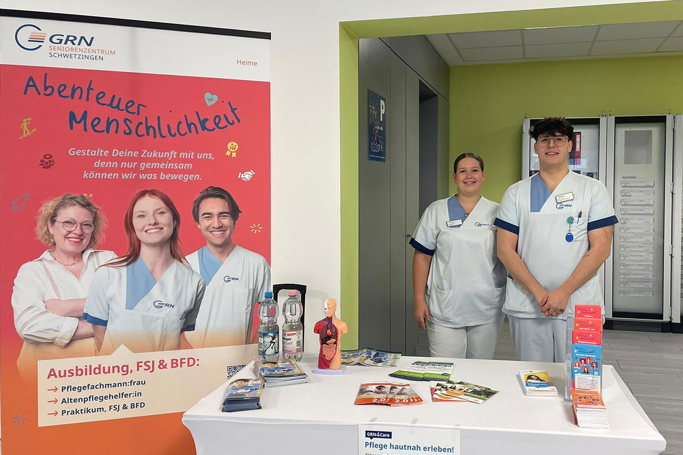 Zum Abschluss der Aktionstage wurden die ausgefüllten Stempelkarten der Teilnehmenden verlost. Kleine Preise, Infostände der Bundesagentur für Arbeit und der Pflegefachschule sowie Informationsmaterialien rund um die Ausbildung an der GRN-Klinik rundeten das Programm ab.