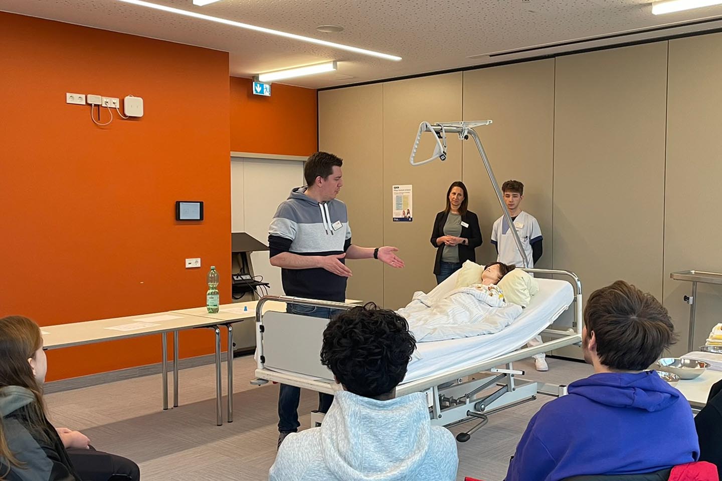 Gearbeitet wurde bewusst in kleinen Gruppen: Jeweils sieben bis zehn Schülerinnen und Schüler wurden von einer Pflege-Auszubildenden oder einem Pflege-Auszubildenden begleitet. Diese sogenannten Azubi-Lotsen führten die Jugendlichen durch die Klinik, erklärten Abläufe und standen während des gesamten Vormittags für Fragen zur Verfügung. So kam jede und jeder zu Wort – und zum Mitmachen.