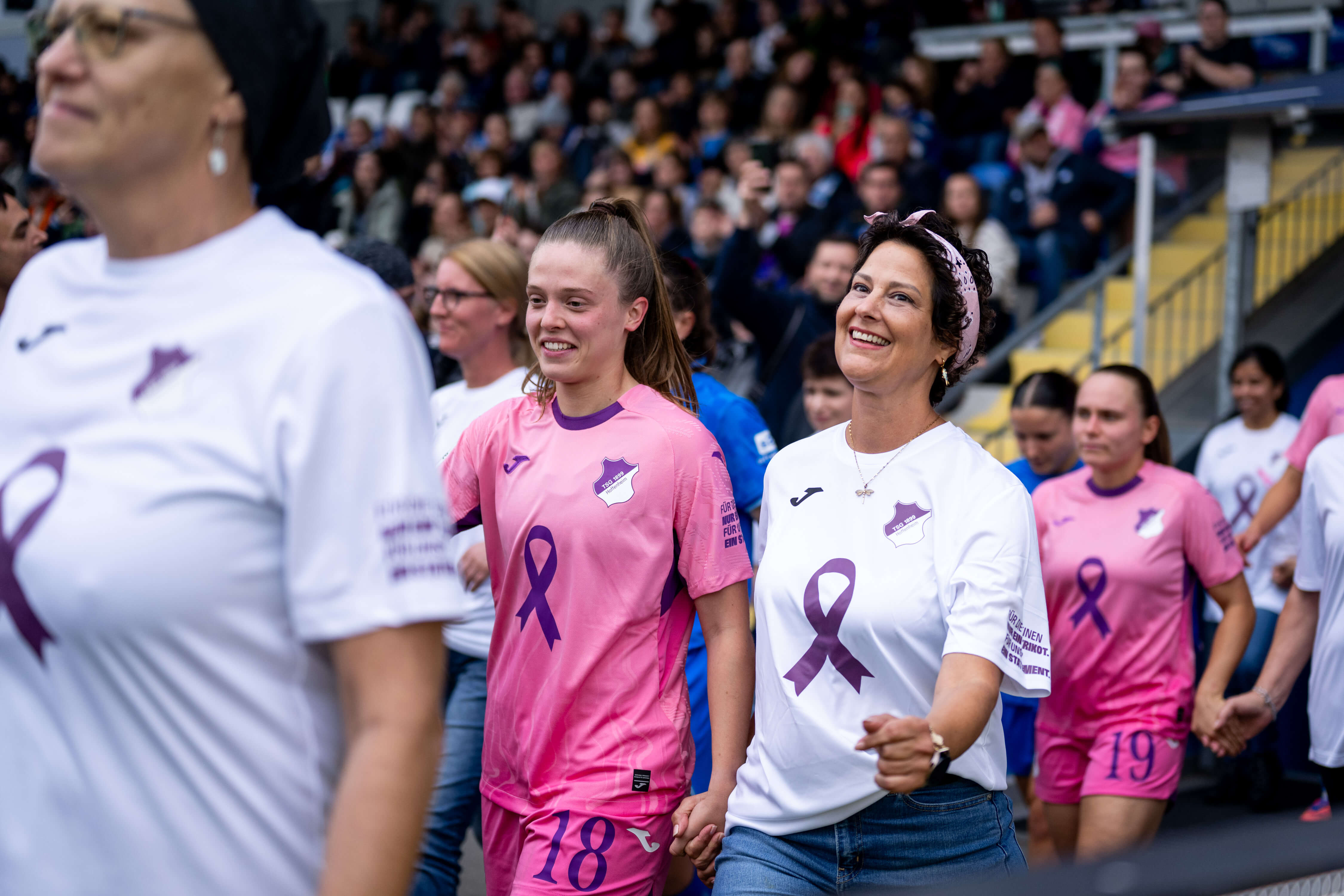 Bereits am 12. Oktober trugen die TSG-Frauen im Heimspiel gegen Bayer Leverkusen das Sondertrikot in Pink und liefen gemeinsam mit Brustkrebspatientinnen ins Stadion ein – ein Symbol für Zusammenhalt und und Solidarität mit allen von Brustkrebs betroffenen Frauen.
